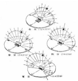 ご存知のように、太陽は季節により日の出・日の入りの方角や、高度・角度が異なります。方角は冬至と夏至では約60度の差がありますし、角度は北緯35度(京都)では冬至は32度、夏至で78度となります。