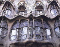 アールヌーヴォー:ヴァトリオ邸(1904) アントニオ・ガウディ設計 19世紀末の20年間と20世紀初頭の10年間に、ヨーロッパやアメリカでおこった革新的な芸術運動。「アール・ヌーボー」はフランス語で「新しい芸術」を意味する。建築、インテリア・デザイン、家具、ポスター、ガラス工芸、陶磁器、織物、挿絵などのひろい表現領域に波及した。つる草のようにうねる曲線を多用した点に特徴がある。 |