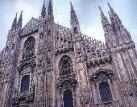 ゴシック:ミラノ大会堂(1577) 12世紀後半に、半円形に窓を開けるアーチの上部を尖らせる方法を考え出した。それまでは厚い壁と多くの柱が必要だったが、これによって壁に多くの窓を開ける事ができるようになった。それによって、より多くの装飾が生まれ、壁という壁は装飾で埋め尽くされた。この様式にもフランス、イタリア、イギリス、ドイツ、スペイン、ポルトガルなどがある。 |