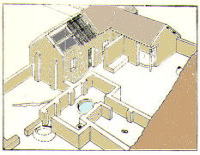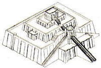 メソポタミア文明の頃(前4500〜4200)の建物で、粘土や土壁で作られている。庭に開く部屋や台所、倉庫からできており、壁には補強のための控壁がある。現代にも通用しそうな合理的な配置。屋根の下地は木造と考えられる。 |