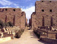 カルナックアメン大神殿の第一塔門カルナックは、前2134年にはじまる古代エジプト第11王朝の時代。守護神アメンをまつった最大でもっとも重要なのがアメン大神殿である。アメン大神殿のもっともすばらしい建築物は多柱式の広間である。高さ21mもある122本の柱が9列にならんで、その天井をささえている。レリーフや碑銘が壁をうめつくし、敷地内には、オベリスク、像、塔門がある。 | |