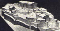 ギリシャ文明・アテネのアクロポリスアテネの黄金時代に造られたギリシャ建築を代表する傑作。中心となるパルテノン神殿は、錯覚を考慮した細かな修正が加えられており、機械的な直線はないと言われている。 | |