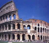 ローマ建築・コロセウム(78〜82)ローマ建築の特徴は半円形のアーチ。ローマ建築はギリシャ様式を良く用いたが、装飾過剰になる事も多くあまりデザイン的に良くなったとはいえない。しかし、水道、道路、要塞などには才能を発揮した。コロセウムは長径188m短径156mで、主体構造はコンクリートと煉瓦を使用している。外装にはトラバーチンや大理石を使用し、柱には半円柱のドリス式、イオニア式、コリント式の3つのオーダーが用いられている。 | |
