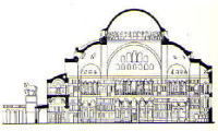 ビザンチン様式・アヤ ソフィア寺院(537)ドームの直径は31m、高さ55mである。この方形の建物にドームを載せる事は、ビザンチン様式になり始めて可能になった。セントピータース寺院、シャルトル大聖堂と並び、キリスト教美術の三大傑作の一つ。 |